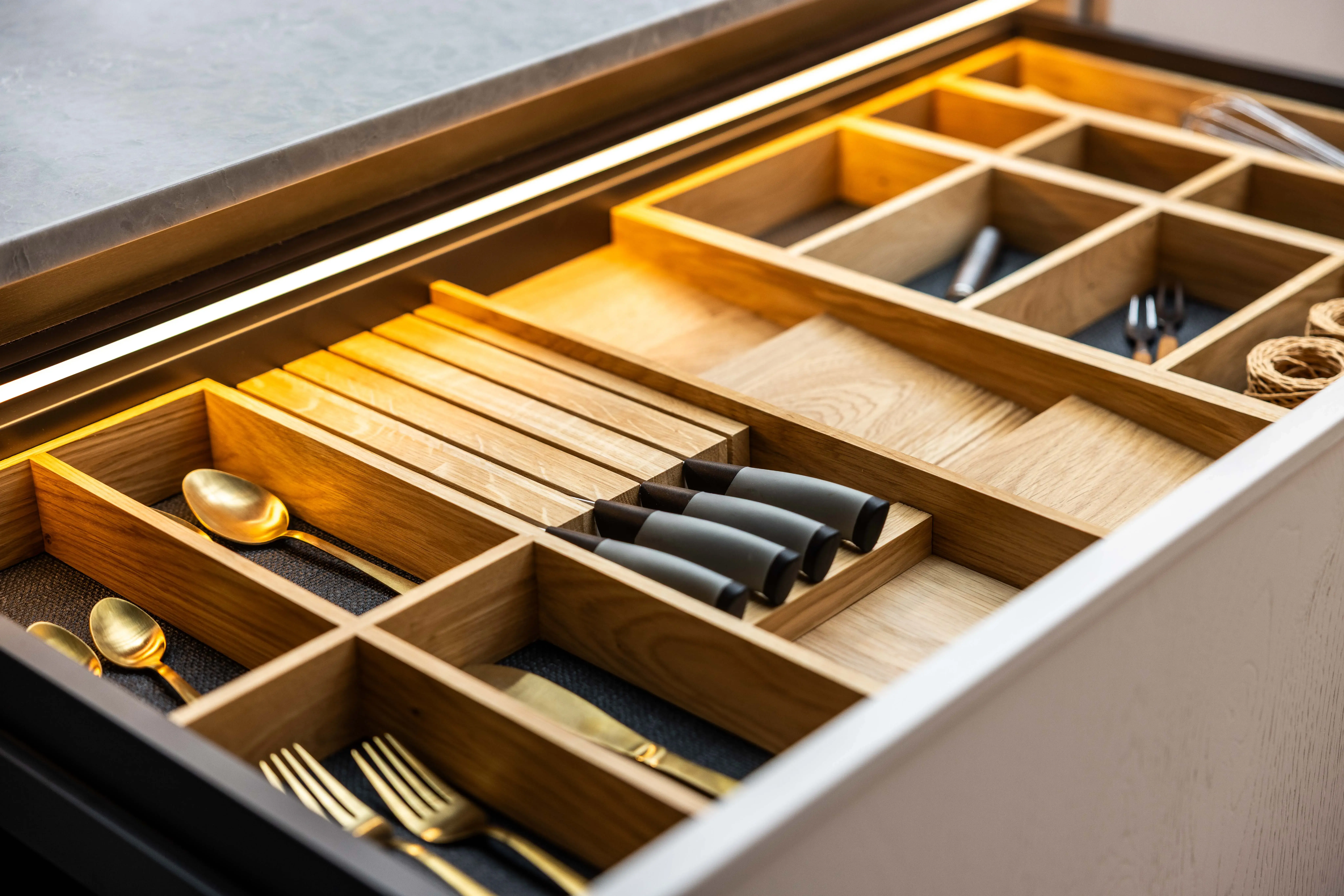 Bei Rotpunkt lässt sich beides perfekt mitein­ander verbin­den – dank 42 Korpus­farben für innen und außen. Auszüge sind in edlem Zirkon mit farblich abgestimmten Soft Close-Scharnieren gestaltet.